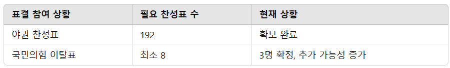 탄핵안이 통과되려면 야권 192석과 국민의힘 내 이탈표 8표가 필요합니다.