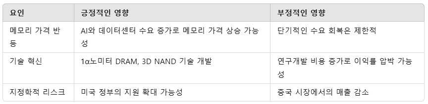 다음은 마이크론의 주가에 긍정적인 요인과 부정적인 요인을 요약한 표입니다