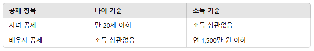 - 배우자 공제: 한 배우자의 소득이 연 1,500만 원 이하일 때 상대방이 공제받을 수 있습니다.