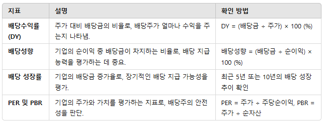 배당주를 선택할 때는 몇 가지 주요 지표를 확인해야 합니다. 아래 표를 참고하세요.