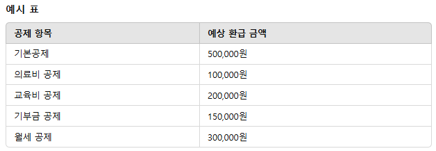 연말정산 환급금 계산 방법 국세청 홈택스를 통해 예상 환급금을 계산할 수 있습니다. 공제 항목별로 계산된 금액을 확인할 수 있으며, 이를 통해 세부 공제를 검토해볼 수 있습니다.