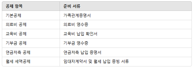 연말정산을 진행하기 위해서는 다양한 증빙서류가 필요합니다. 각 공제 항목에 해당하는 서류를 정확히 준비해야 하며, 아래 표를 통해 기본적으로 준비해야 할 서류를 정리했습니다.