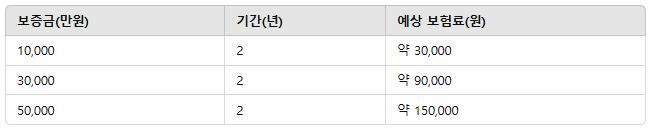 보험료는 보증금, 계약 기간, 그리고 보험사의 기준에 따라 달라집니다. 아래 표는 예상 보험료 계산 사례입니다