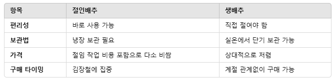 절인배추는 편리함과 효율성을 제공하지만, 품질과 구매처에 따라 결과가 달라질 수 있습니다. 위의 팁을 활용해 신중히 선택하면 맛있는 김치를 담글 수 있을 것입니다.