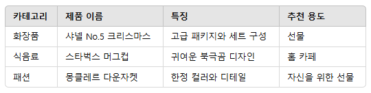 2024년 크리스마스 한정 에디션은 품질과 디자인 모두 뛰어난 제품들로 소장 가치를 높이고 선물로도 적합합니다. 각 브랜드의 매장을 방문하거나 공식 홈페이지를 통해 자세한 정보를 확인하세요. 한정판이니 서두르는 것이 좋습니다!