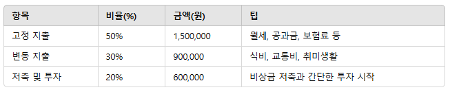 아래 표는 월급 300만 원 기준으로 효율적인 자산 분배 비율을 나타냅니다.